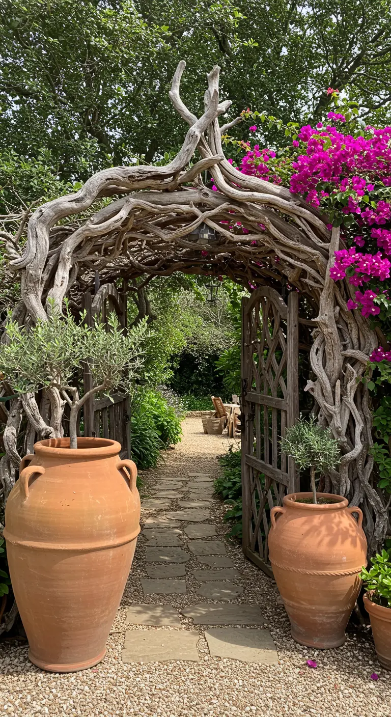 Sal a buscar ramas secas y retorcidas en el campo o la playa (¡driftwood!). Con ellas puedes crear un arco de entrada único y escultural.