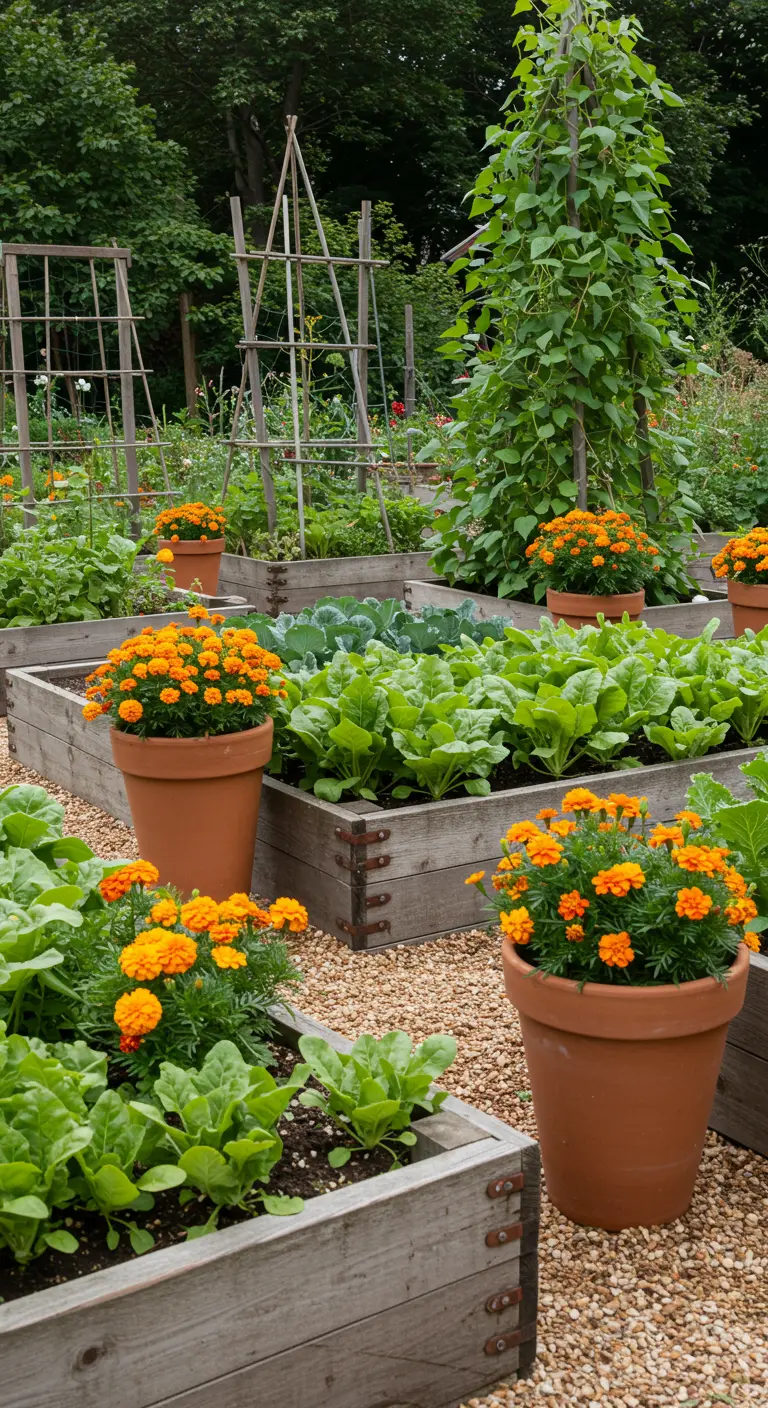El truco de experto: intercala macetas de barro con caléndulas (tagetes) entre los bancales. Su olor repele plagas de forma natural y su color naranja vibrante añade una nota de alegría increíble. Lograrás decoraciones que mezclan primavera y verano en tu huerto.