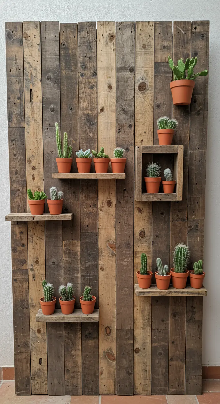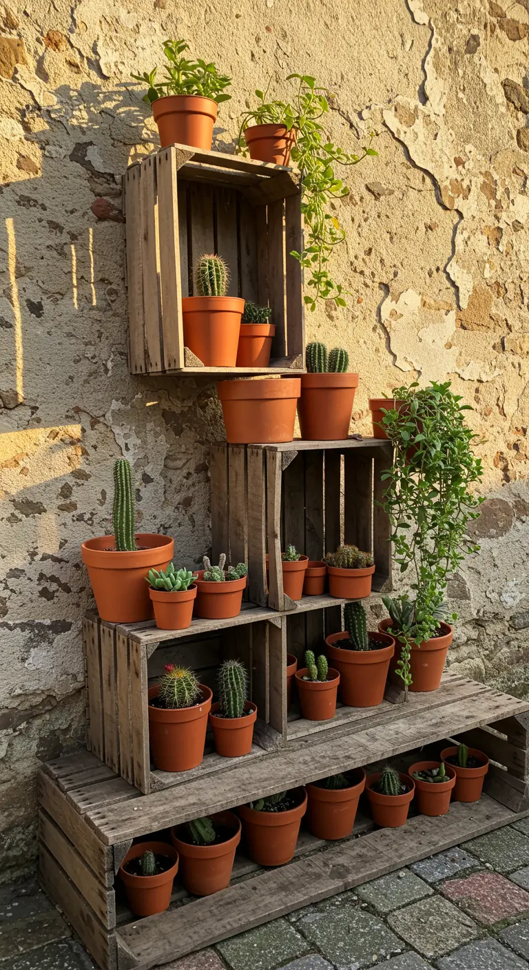 Asegura las cajas entre sí con algunos tornillos para mayor estabilidad. Ahora, llénalas con tu colección de cactus y crasas en macetas de terracota. ¡El contraste es una maravilla!