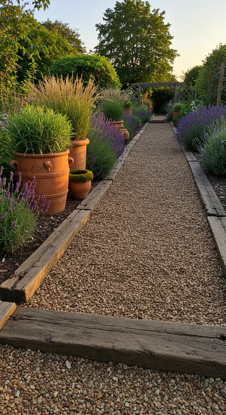 Delimita el sendero con ellas, hundiéndolas ligeramente en la tierra para que queden firmes. Rellena el interior con una capa de grava de canto rodado en tonos cálidos.