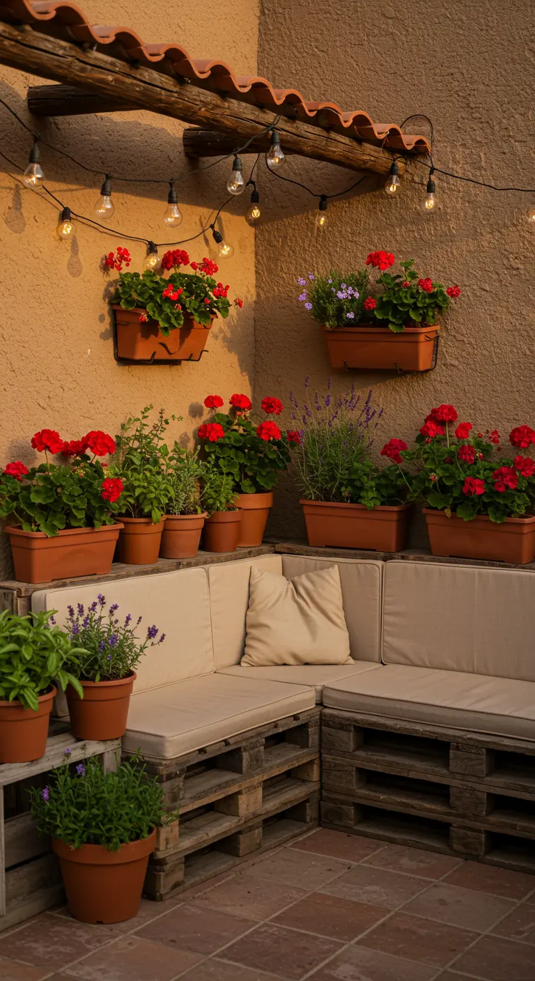 Completa el rincón con geranios rojos y lavanda en macetas de barro, y una guirnalda de luces cálidas para esas noches que no quieres que acaben.