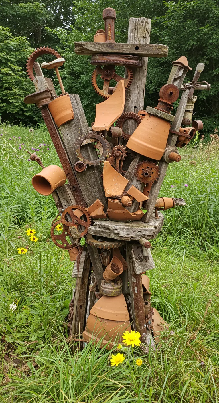 Usa un poste de madera como eje central y empieza a clavar, atornillar y pegar tus «tesoros». Combina engranajes oxidados, trozos de terracota, pomos viejos…