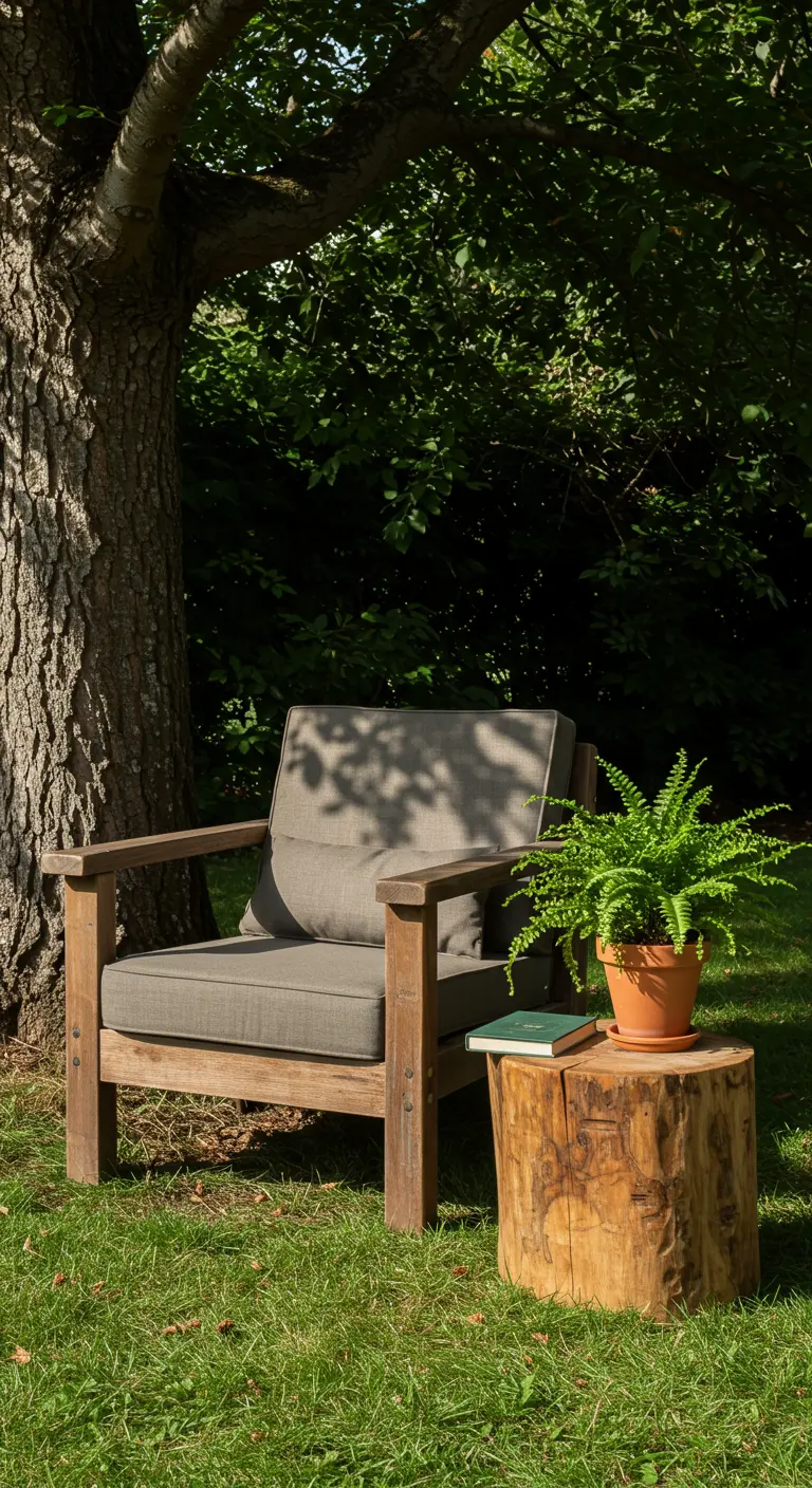 A veces, solo necesitas un rincón para desconectar. Busca la sombra de un buen árbol y coloca un sillón de madera cómodo, con cojines mullidos.