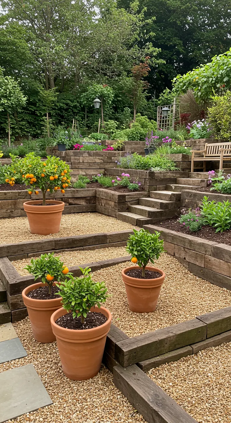 Rellena algunos niveles con grava para crear zonas de paso o para colocar macetas, y otros con tierra para plantar flores y arbustos. Coloca algunos cítricos en grandes macetones de barro para un toque mediterráneo. Inspírate en los jardines mediterráneos para la elección de plantas.
