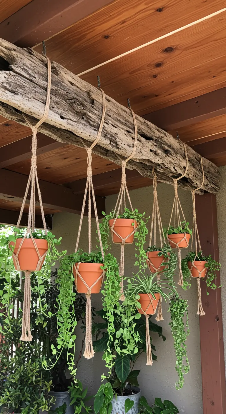 Coge una viga de madera vieja o un trozo de madera de deriva (driftwood) bien grande y cuélgalo del techo de tu porche o terraza con cuerdas resistentes.