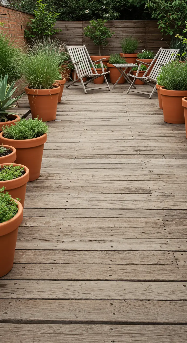 La clave para que no se vea vacía es usar macetas de terracota de gran tamaño como puntos focales. Agrupa varias de distintos tamaños en las esquinas o para delimitar zonas.