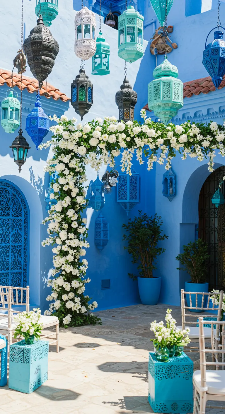 Inspírate en la famosa “Ciudad Azul” de Marruecos para una temática fresca y vibrante.