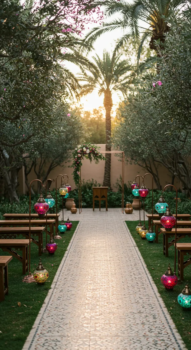 Define el pasillo de la ceremonia de una manera inolvidable. En lugar de las típicas flores, marca el camino con farolillos de colores vibrantes.