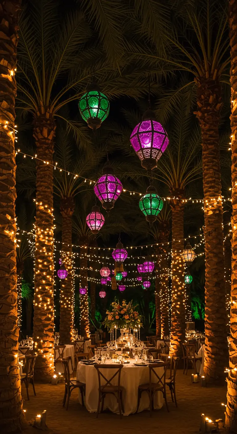 Luego, cuelga farolillos de colores vibrantes, como magenta y verde, de las ramas. El contraste con el entorno oscuro de la noche será deslumbrante.