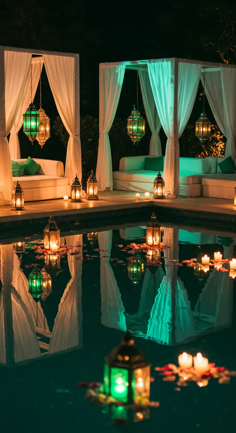 Cuelga un farol de color intenso, como verde esmeralda, en el centro de cada cenador. La luz se filtrará a través de las telas y se reflejará en el agua.