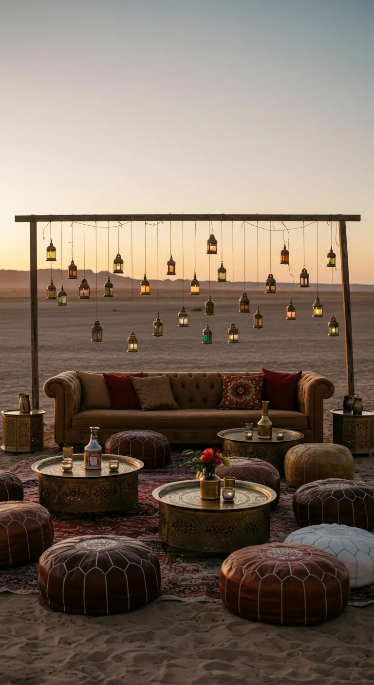 Completa el espacio con pufs de cuero, cojines boho y mesas de latón repujado para que tus invitados se relajen con estilo.