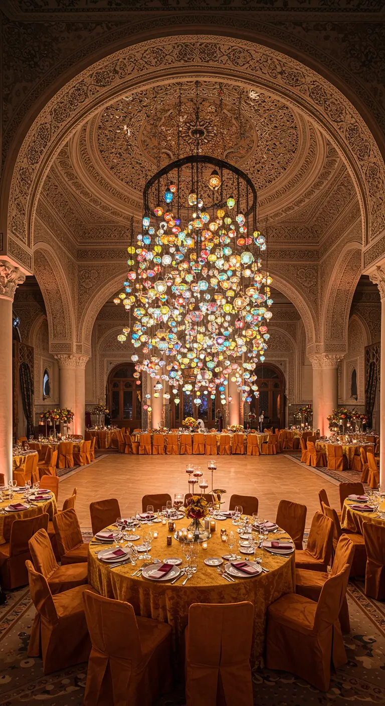 Estas piezas aportan una luz suave y difusa, creando un ambiente sofisticado y elegante, perfecto para una boda de etiqueta.