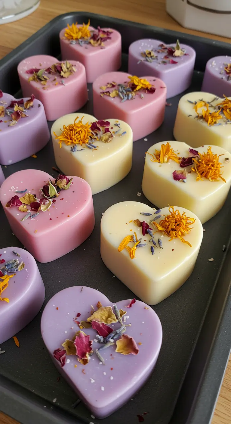 Usa un molde de silicona para bombones o cubitos de hielo con forma de corazón. Vierte cera teñida de colores pastel y, antes de que solidifique por completo, decora cada corazón con lavanda, pétalos de rosa y caléndula.