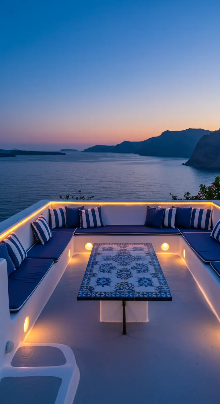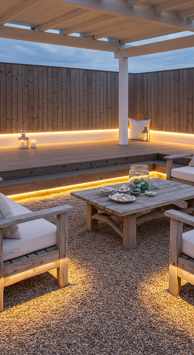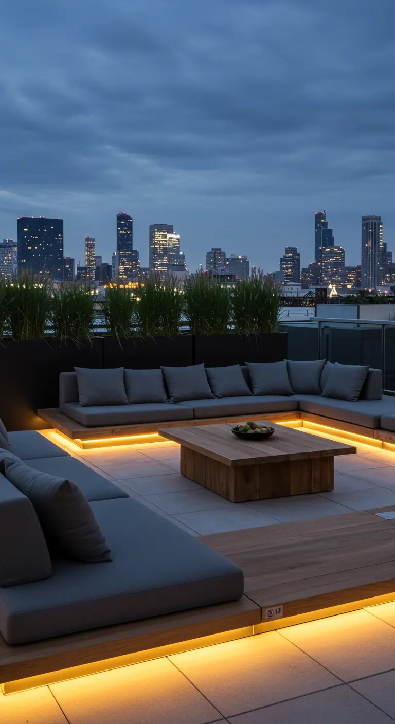 Eleva tu terraza al siguiente nivel instalando tiras de LED resistentes al agua justo debajo del borde de los sofás modulares.