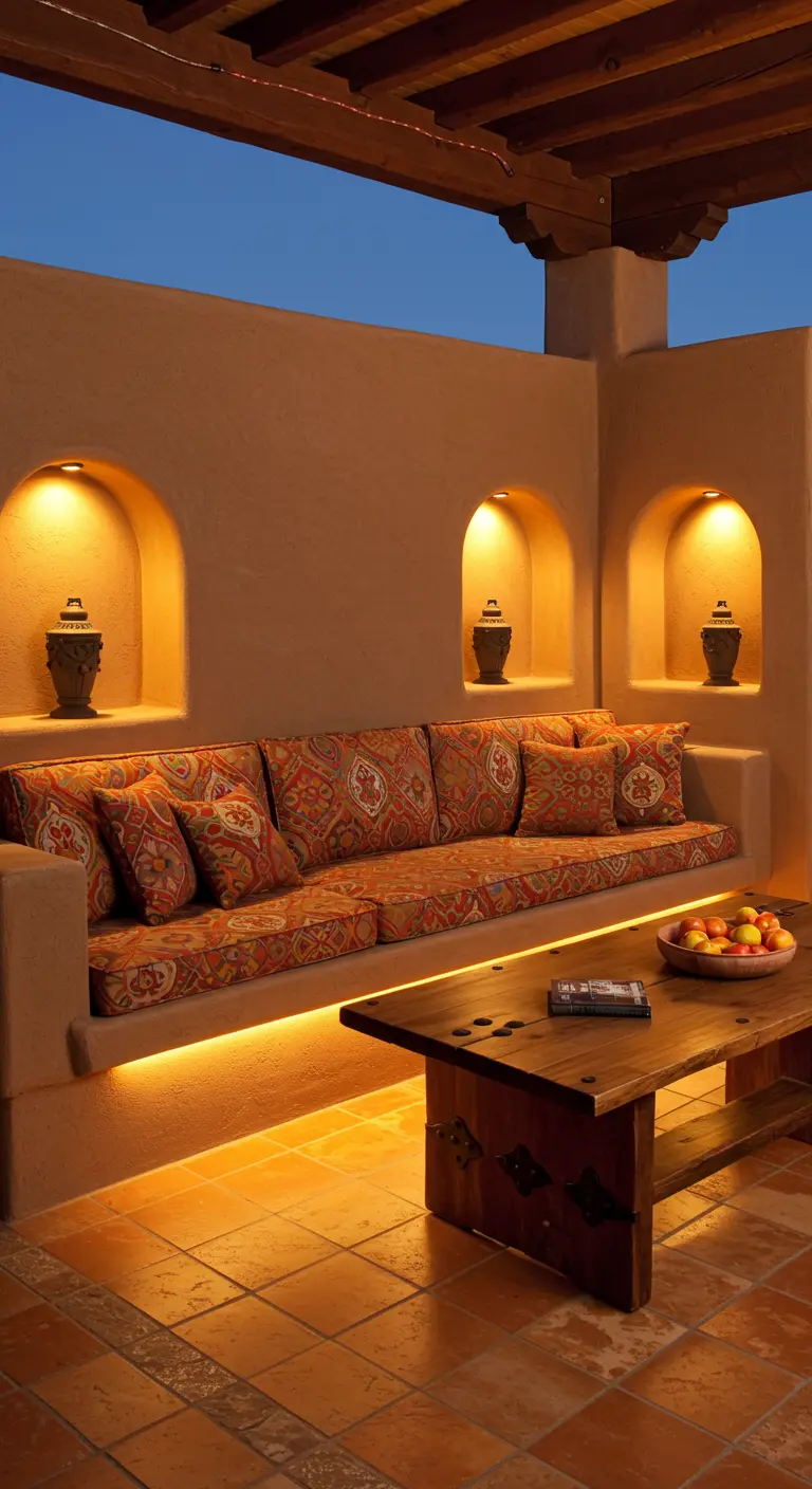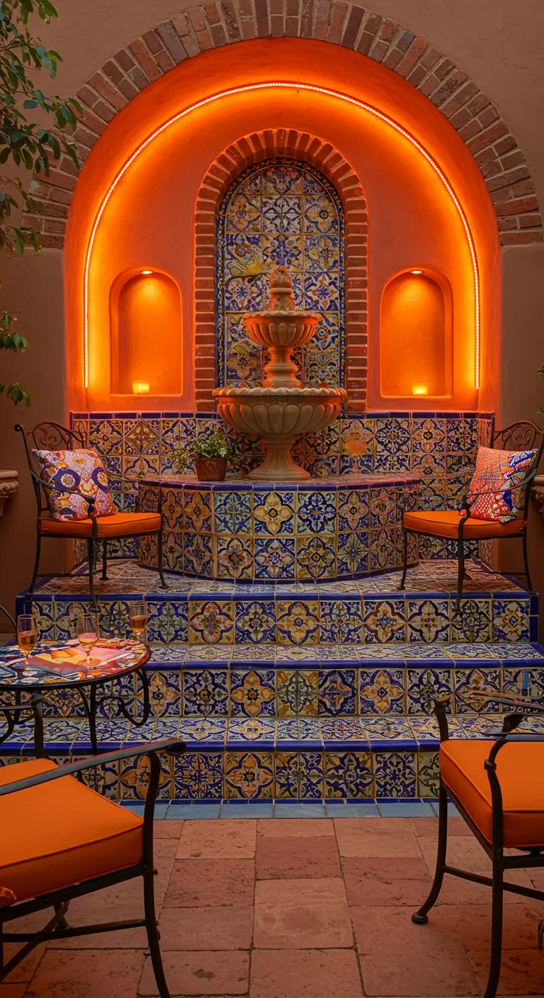Coloca una tira de LED flexible siguiendo la curva interior del arco. Elige un tono anaranjado o ámbar para resaltar los colores cálidos de los azulejos y la terracota.