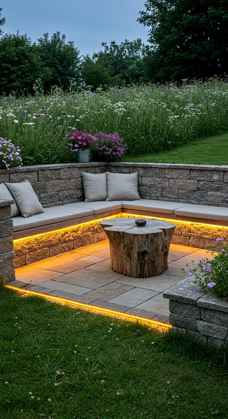 El efecto es espectacular: la luz cálida rebota contra el suelo de piedra y resalta la textura robusta del muro, convirtiendo un simple asiento en el punto focal del jardín.