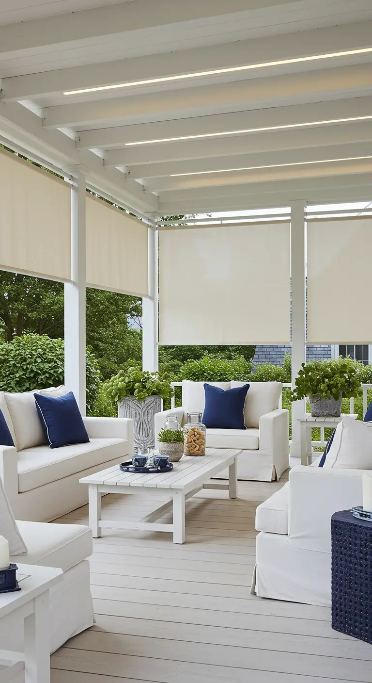 En un porche de estilo costero, la iluminación debe ser fresca y sutil, como la brisa del mar.