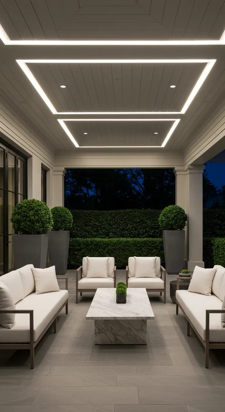 Para un ambiente *hygge* instantáneo, enmarca el techo de tu porche cubierto con una tira de LED de luz cálida.