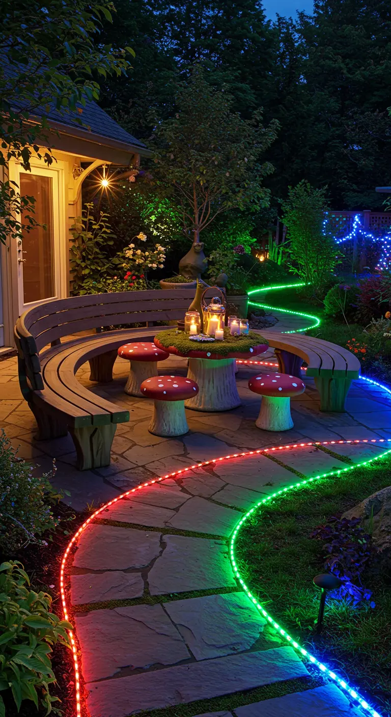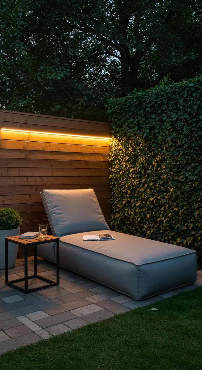 En un patio a nivel del suelo, la iluminación desde abajo es pura magia. Instala tiras de LED bajo los bancos y las tarimas de madera.
