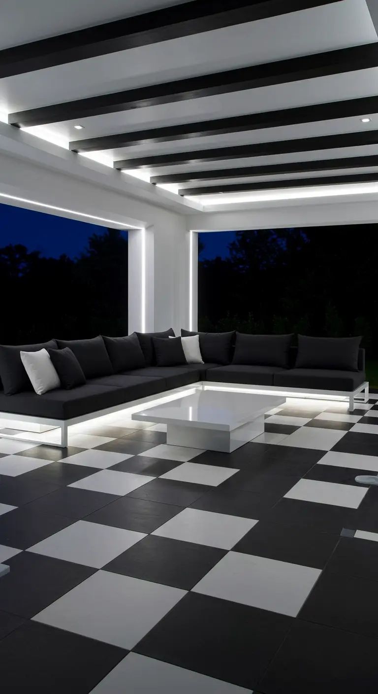 La luz acentúa las líneas limpias y la geometría del diseño, mientras que el suelo de damero añade un toque gráfico y atrevido.