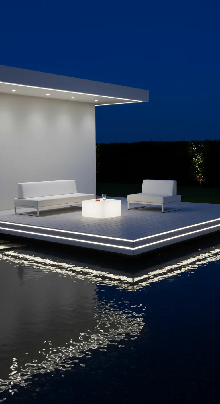 La luz seguirá la silueta del banco, creando un anillo de resplandor cálido que enmarca la zona del brasero. Elige una tira de LED de un solo color y tono cálido para no competir con el baile de las llamas.