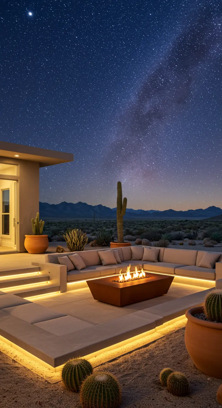 Instala las tiras bajo los escalones y los asientos de hormigón pulido. El resplandor dorado sobre la arena y los cactus crea una atmósfera de otro mundo.