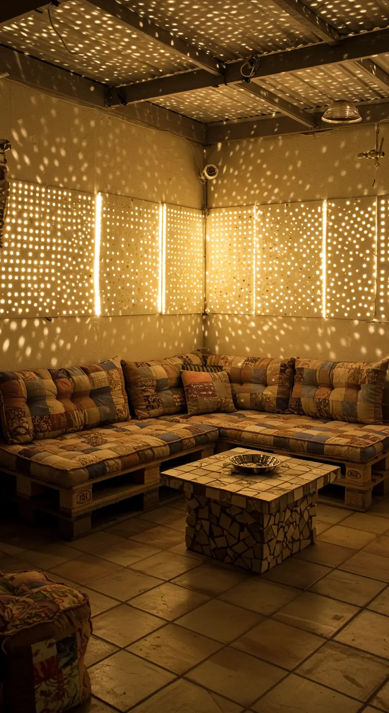Puedes usar planchas de metal cortadas con láser, paneles de madera calados o incluso celosías decorativas. La luz se filtrará a través de los agujeros, proyectando un tapiz de sombras y luces en las paredes y el techo.