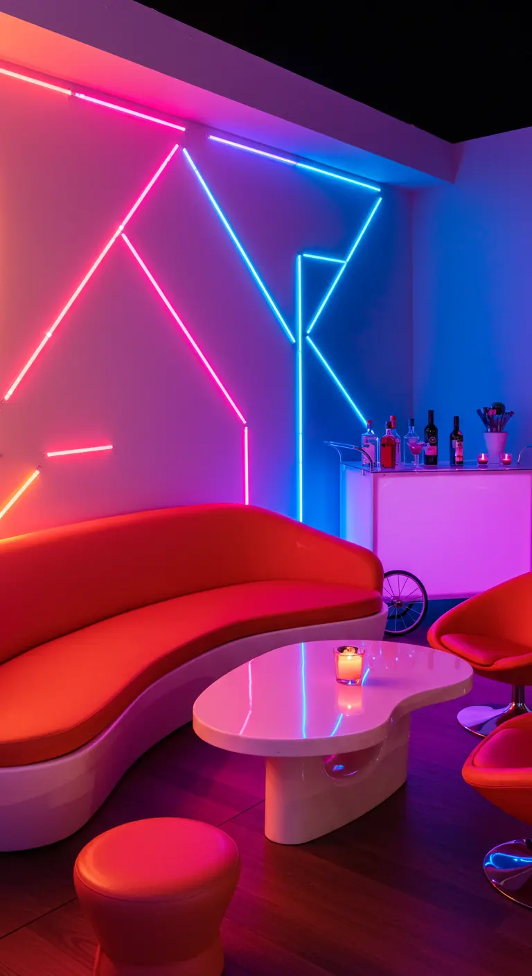 ¡Saca tu lado más atrevido! Usa tiras de neón LED flexibles para dibujar formas geométricas o abstractas en una pared. Son seguras, de bajo consumo y el impacto visual es increíble.