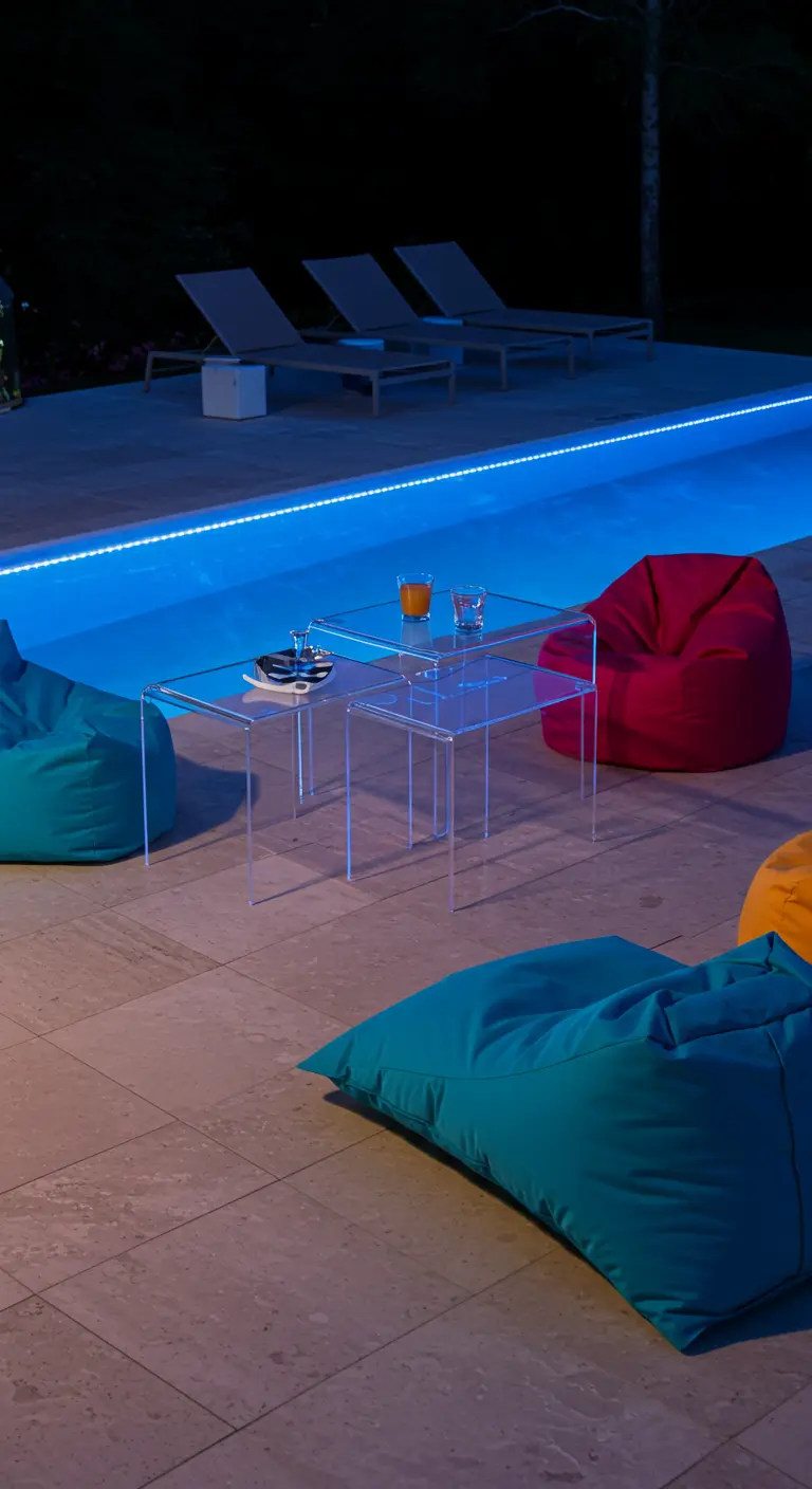 Combina la iluminación con asientos informales y coloridos, como estos pufs. Son ligeros, resistentes al agua y perfectos para crear una zona chill-out flexible y divertida.