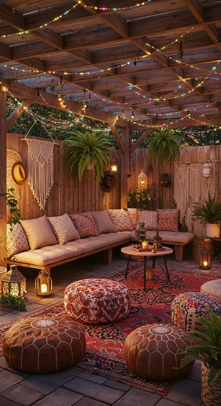 Transforma tu pérgola en un refugio mágico tejiendo guirnaldas de luces de colores entre las vigas de madera. ¡No sigas un patrón estricto! La clave del look boho es que parezca espontáneo y relajado.