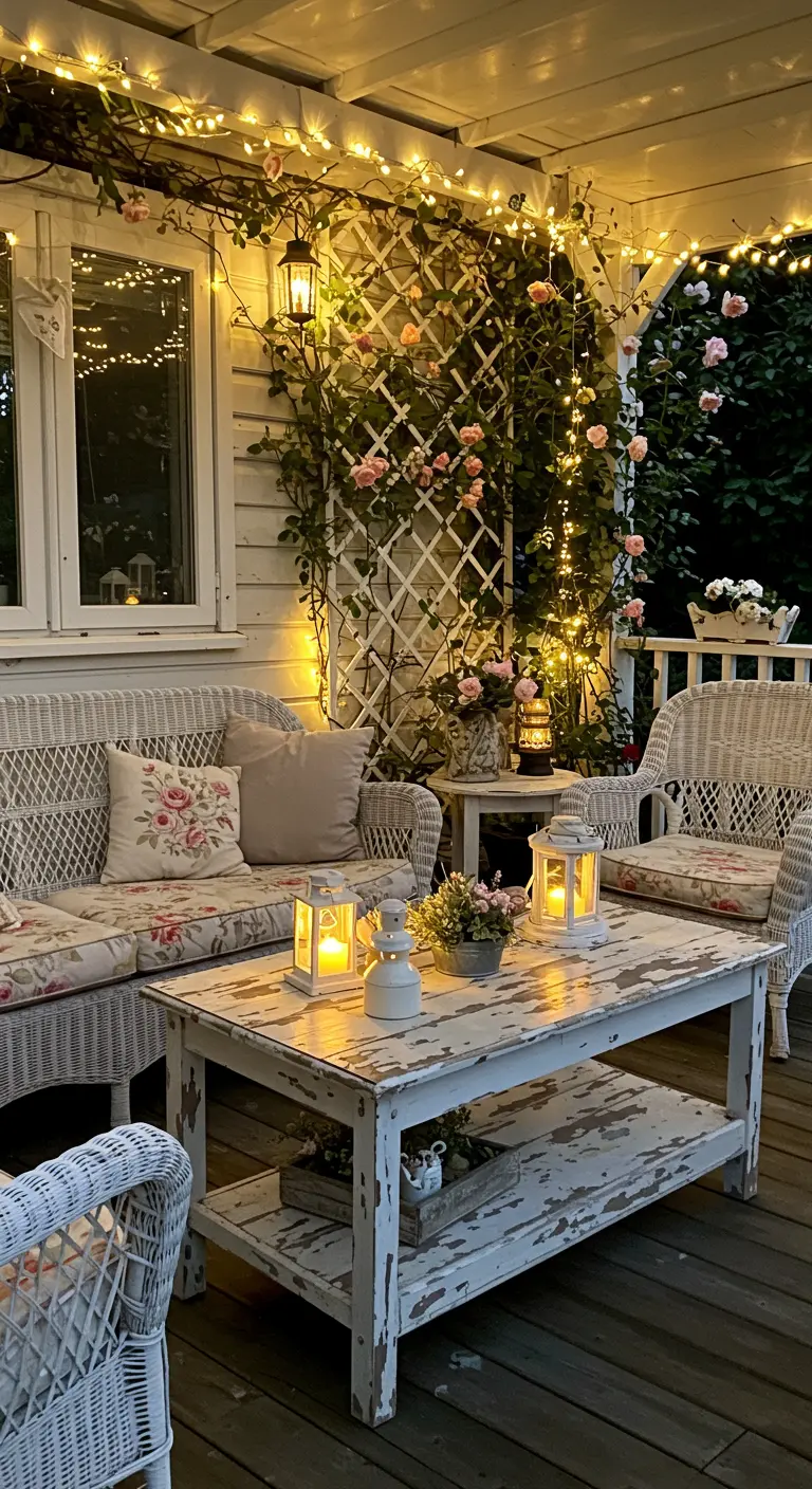 Para un porche romántico de estilo *cottage*, la clave es la delicadeza. Cuelga guirnaldas de luces pequeñas y cálidas, como si fueran luciérnagas, sobre una celosía donde trepen tus rosales.